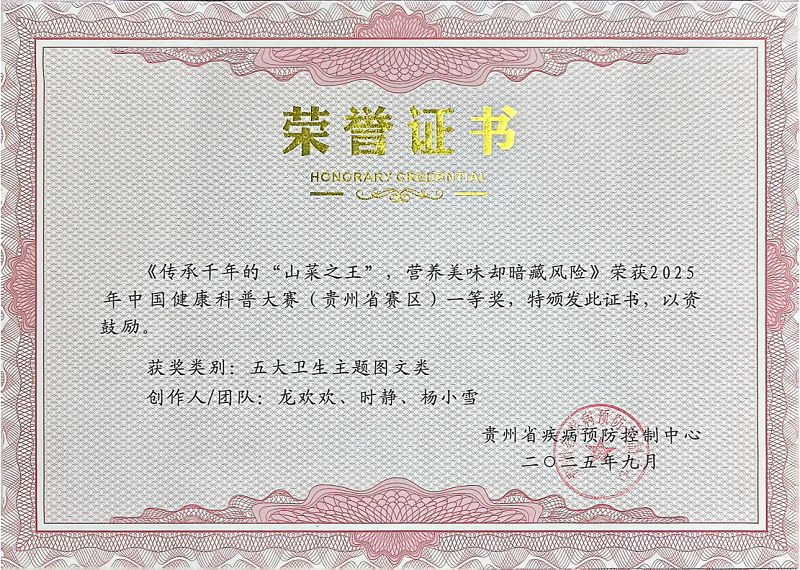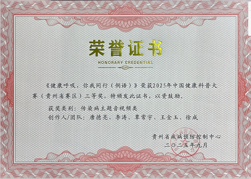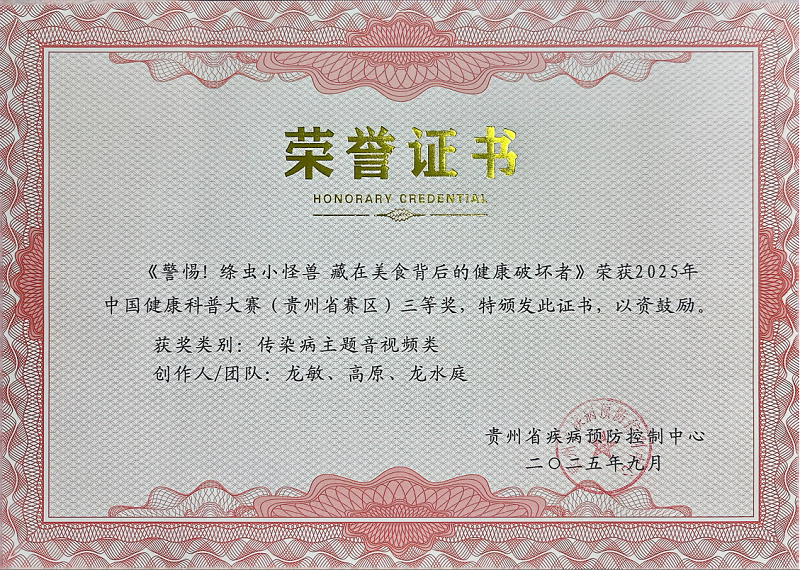 此前,2025年中国健康科普大赛贵州省赛区评选工作已圆满落幕,赛事由贵州省疾病预防控制中心承办,我中心(所)多件科普作品表现突出,共斩获4项省级荣誉。其中,结防科创作的《健康呼吸,你我同行(苗语)》获传染病主题表演类一等奖,《健康呼吸,你我同行(侗语)》获传染病主题音视频类三等奖;学校卫生科创作的《传承千年的“山菜之王”,营养美味却暗藏风险》获五大卫生主题图文类一等奖;流病科创作的《警惕!绦虫小怪兽藏在美食背后的健康破坏者》获传染病主题音视频类一等奖。