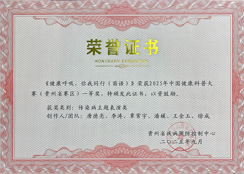 近日,由中国疾病预防控制中心(中国预防医学科学院)主办的2025年中国健康科普大赛评选结果揭晓,黔东南州疾控中心(黔东南州卫生监督所)创作的《健康呼吸,你我同行(苗语)》作品,荣获传染病主题表演类优秀奖,再添国家级荣誉。