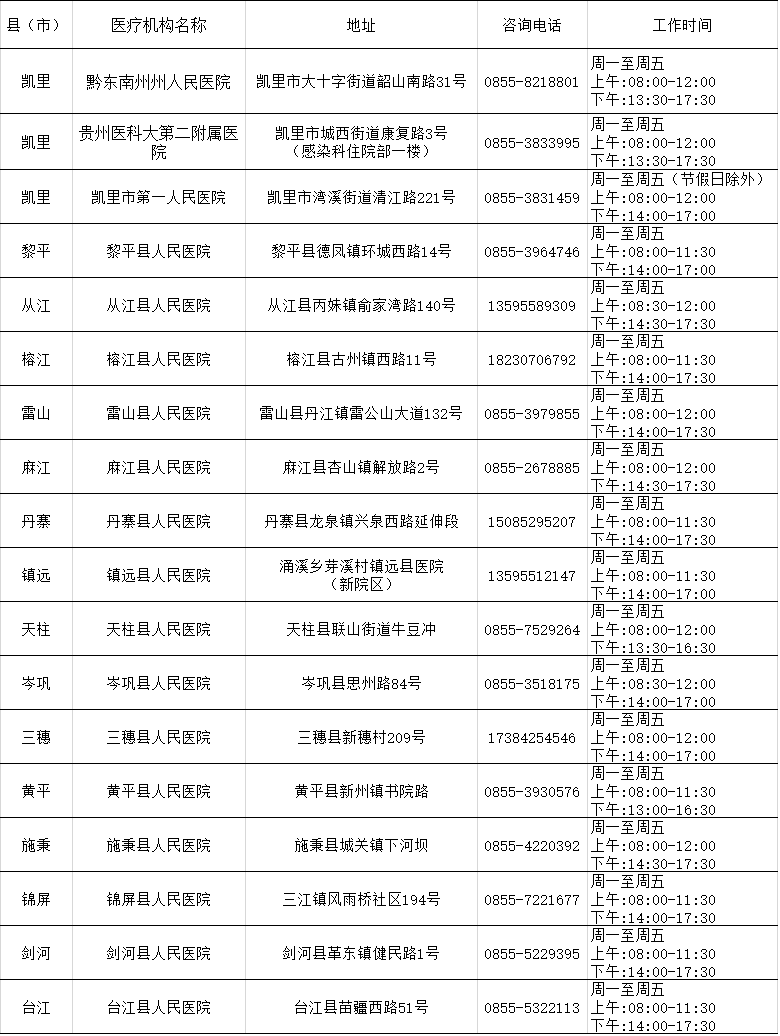 黔东南州结核病潜伏感染预防性治疗门诊信息一览表